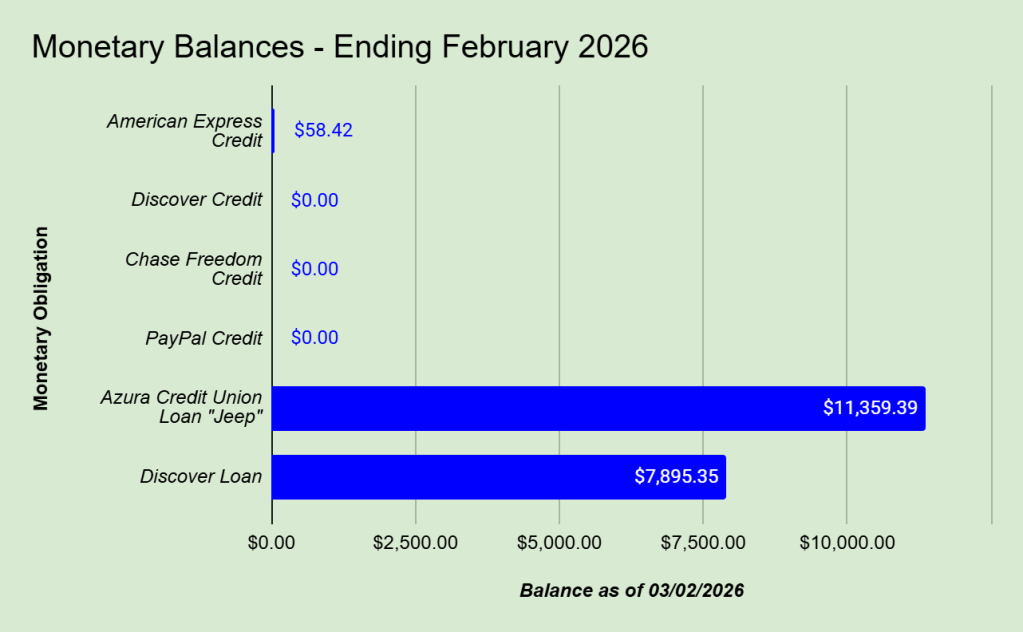 The Jeep balance increased in March 2026, which was not projected, adding approx $500 to the total Jeep balance. An unapproved transaction occurred during March that resulted in funds being diverted from the Discover Loan Payment to General Fund Spending.